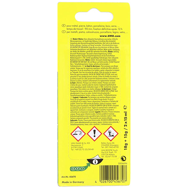 Adesivo bicomponente a base di resina epossidica per incollaggi difficili che richiedono forte resistenza e tenuta. Il prodotto consente incollaggi resistenti nel tempo, agli urti, all'umidita' e alle temperature (dai - 20 C ai + 100 C). Ideale per incollare materie plastiche, metalli, pietra, calcestruzzo, porcellana, ceramica, legno, vetro e derivati del vetro, polistirolo espanso.