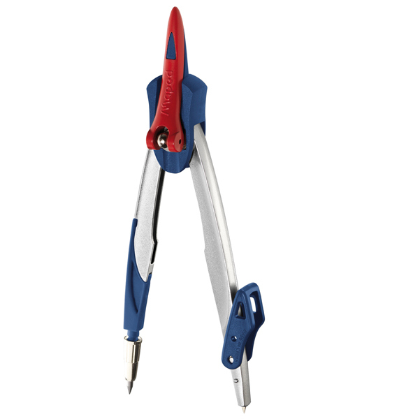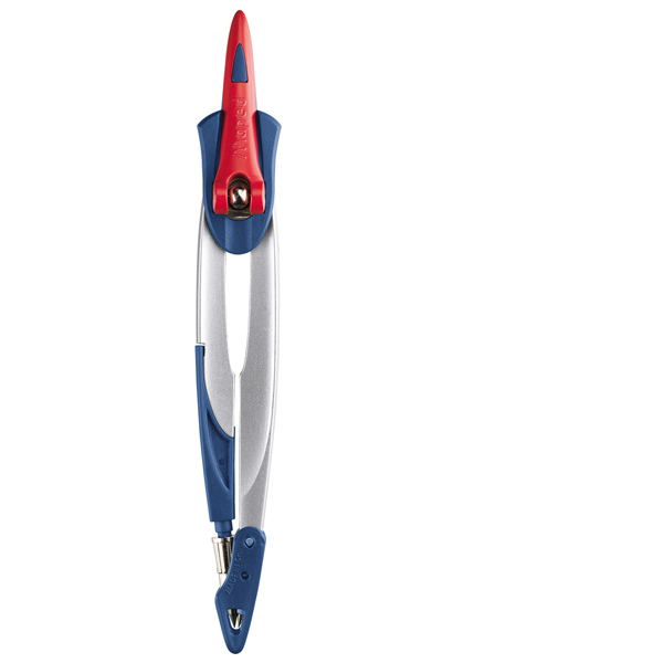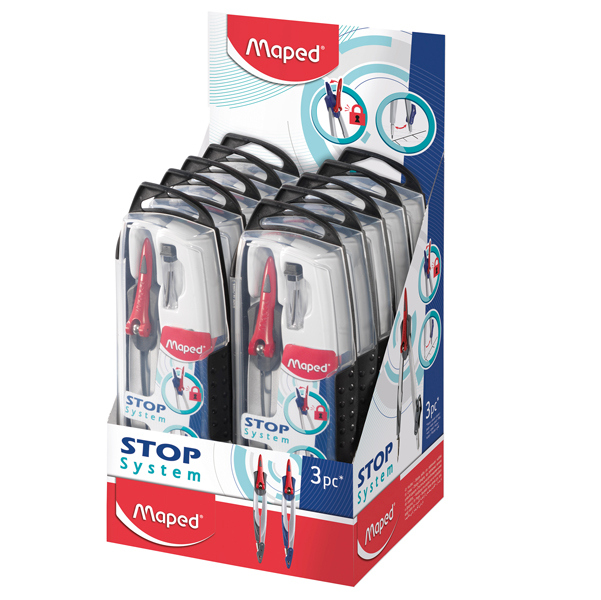 Set da 3 pezzi (1 compasso stop system, 1 adattatore universale, 1 astuccio mine). Particolarita' del compasso e' la leva brevettata per il blocco delle aste. diametro max cerchio 282mm.