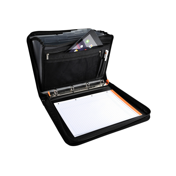 Converenziere Exafolder con maniglia e chiusura a zip. Dotato di uno spazio classificatore, buste a zip, scomparto imbotito per tablet, spazio per portapenne. Perfetto per prendere appunti, archiviare documenti forati nella parte raccoglitore o diversi documenti nella parte classificatore, oltre a tutti oggetti di cancelleria che si possono inserire nelle diverse tasche. Ideale per trasportare documenti forati o non-forati. Formato esterno 27x36 cm.