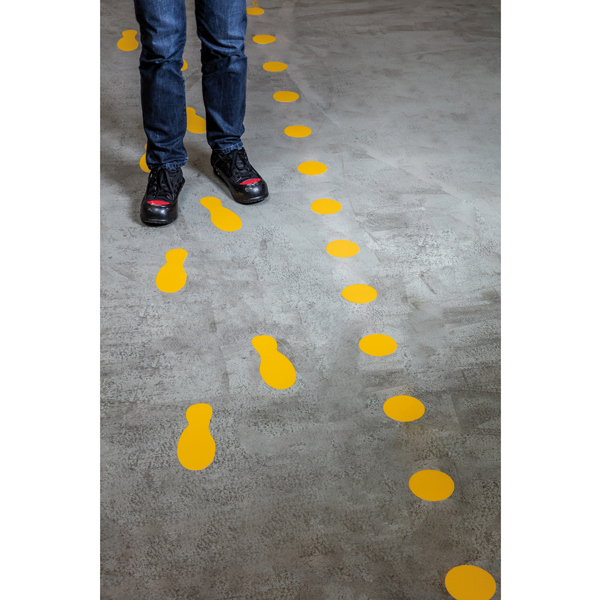 Segnaletica da pavimento sagomata per l'individuazione di aree pericolose, spazi di stoccaggio, passaggi pedonali ecc. Forma: Punto - Simbolo adesivo per l'applicazione su pavimenti nelle aree interne - Robusto e resistente alle abrasioni - Resistenza allo scivolamento R9 conforme alla normativa DIN 51130 - Colore: RAL 1003 giallo segnale - Dimensioni: Ø 100 mm, spessore 0,7 mm