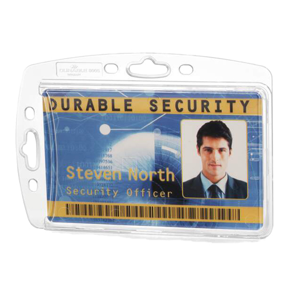 Portabadge rigido in acrilico trasparente crystal-clear. Dotato di un fermo interno per mantenere in posizione il badge una volta inserito e di asola sulla parte frontale che ne facilita la rimozione. Utilizzabile sia in posizione verticale sia orizzontale, puo' essere agganciato a clip, cordoncini, catenelle e chiocciole yo-yo. Dimensioni inserto: 54 x 87 mm (HxL).