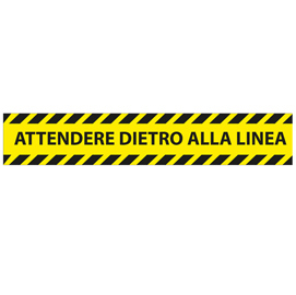 Adesivo per pavimento in pvc 165mg2. Patinato. Completo di stampa ''attendere dietro la linea''. Dimensioni: l45cm - h 8cm. Confezione da 5 pezzi.