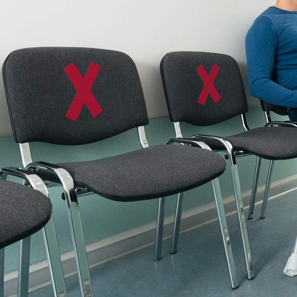 Simbolo adesivo rimovibile adatto a superfici in tessuto o in plastica in aree interne. Ideale per contrassegnare sedie e tavoli da non utilizzare, in base alle normative vigenti sulla distanza di sicurezza. Colore RAL 1001 rosso. Dimensioni 13,5x0,02x19,3cm.
