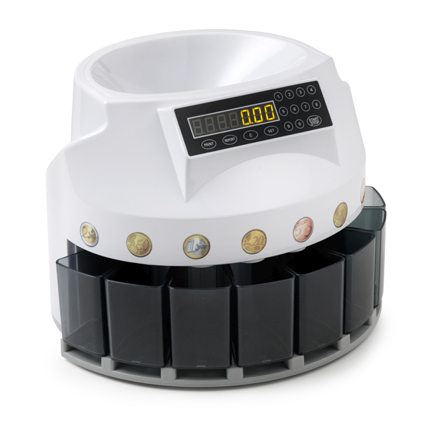 Conta dividi monete Euro a 8 cassetti, di facile utilizzo, silenziosa e veloce. Funzioni: BATCH: permette di impostare una quantita' predefinita di monete da contare; ogni volta che il numero selezionato viene raggiunto la macchina si ferma. In caso di utilizzo con conteggio libero (funzione batch non attivata), l'arresto avverra' quando premuto il tasto START/STOP. REPORT: visualizzazione a display dei risultati di conteggio suddivisi per denominazione; PRINT: stampa del report visualizzato a display su stampante termica dedicata (cod.87185).
