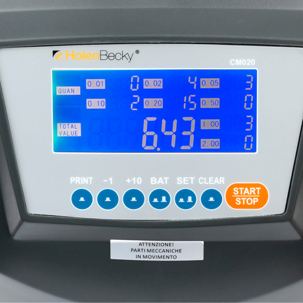 Conta-divide monete Euro in 8 cassetti,silenziosa e veloce, con display LCD di ultima generazione. Dotata di funzione batch memorizzabile e dell'innovativa funzione REPORT di conteggio a display. Capacita' di carico 300/500 monete. Capacita' dei cassetti 180/230 monete. Velocita' di conta 215 monete/minuto. Display digitale LCD (retroilluminato blu). Alimentazione AC 220V 50Hz. Dimensionimm. 321 (D) x 270 (H). Peso kg. 4,50.