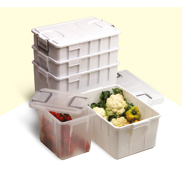 Contenitori food box con coperchio. In polipropilene riciclabile. I contenitori sono sovrapponibili con coperchio e impilabili senza coperchio. Dotati di manici. Idonei al contatto con alimenti. Colore bianco. Dimensioni: L58 x P38 x H38cm - 60 litri.