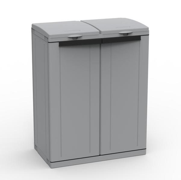 Armadietto a due ante ideato per la raccolta differenziata dei rifiuti. Dotato di due porta-sacco da 110 lt ciascuno chiudibili con coperchio. L'apertura delle ante permette una facile estrazione frontale dei sacchi pieni. Adatto per utilizzo in ambiente esterno . Da montare. Dimensioni: 68x39x88,7cm - 110+110lt. Prodotto eco-friendly realizzato al 100% con plastica riciclata e riciclabile al 100%. Grigio-nero.