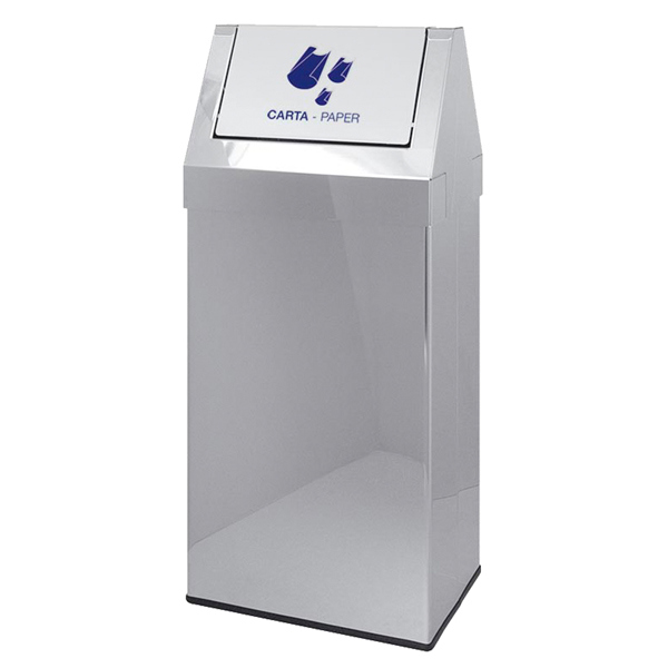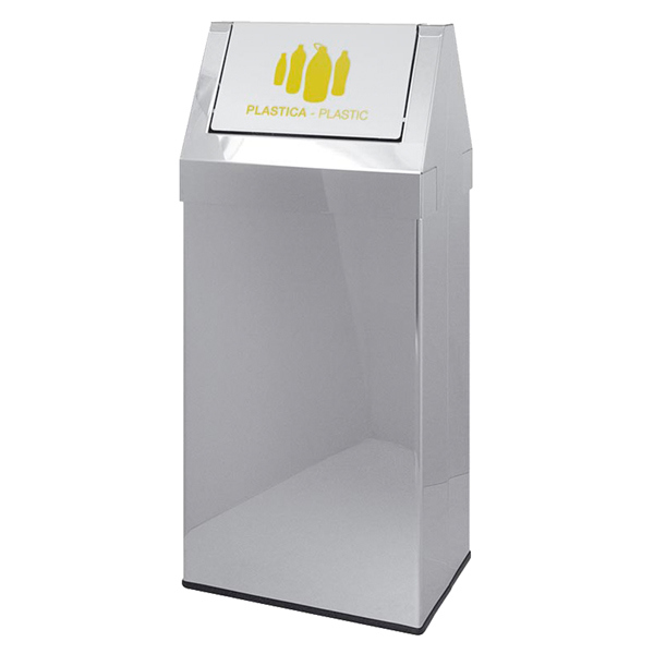 Contenitore rettangolare in acciaio inox con coperchio basculante per raccolta differenziata. Articolo costruito in lamiera d'acciaio INOX aisi 430 spessore 7/10 con apertura coperchio basculante in acciaio INOX aisi 430 spessore 7/10 in finitura scotch brite. Nell'imballo sono incluse le etichette per carta,plastica,generico e vetro. Dimensioni: 20x30xH70cm. Made in Italy.