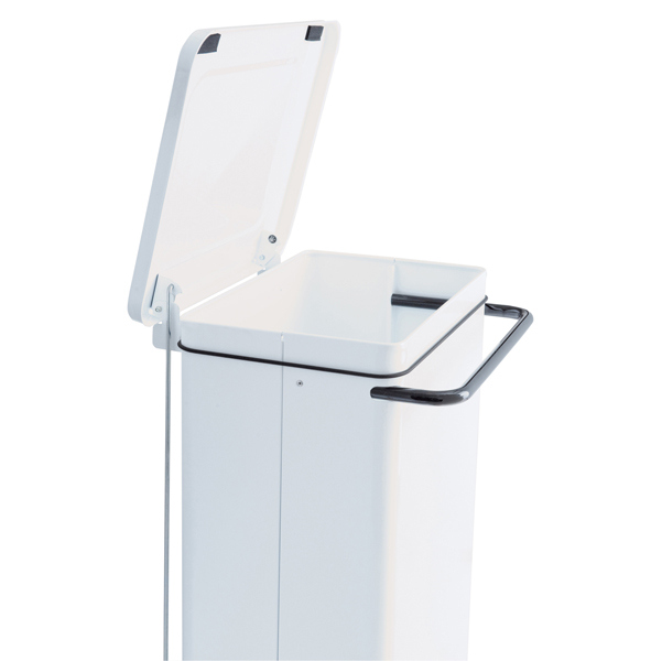 Contenitori mobili a pedale con struttura e coperchio in metallo verniciato bianco con polvere epossidica. Frontale asportabile per facilitare il ricambio del sacco. Ampio pedale per utilizzo conforme a HACCP. Ruote in gomma diametro 95mm. L48 x P42 x H96,5cm. Si consiglia di pulire la superficie con un panno morbido, imbevuto d'acqua o con un prodotto specifico non aggressivo. Non utilizzare detergenti contenenti acetone, metiletilchetone, percloroetano, toluene, tricloroetano, xilene, idrato d'ammonio, idrato di sodio.