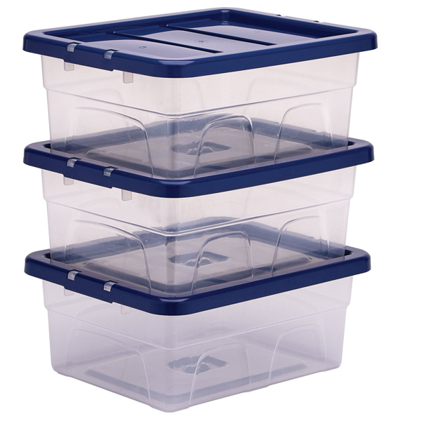 Contenitori multiuso trasparente con coperchio blu, per organizzare il tuo spazio di lavoro o personale. Progettati per annidarsi l'una nell'altra quando sono vuote o per impilarsi quando sono piene. Il coperchio antipolvere, realizzato al 100% con plastica riciclata post-consumo, protegge il contenuto e le chiusure a scatto lo mantengono in posizione. I contenitori sono realizzati in polipropilene 100% privo di BPAe completamente riciclabile.