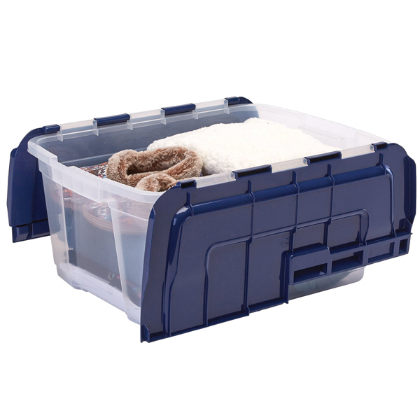 Contenitori multiuso trasparente con coperchio blu incernierato, per organizzare il tuo spazio di lavoro o personale. Progettati per annidarsi l'una nell'altra quando sono vuote o per impilarsi quando sono piene. Il coperchio, realizzato al 100% con plastica riciclata post-consumo, e' diviso in 2 meta' per offrire opzioni di apertura. Maniglie integrate nella base per facilitare il sollevamento e il trasporto. I contenitori sono realizzati in polipropilene 100% privo di BPAe completamente riciclabile.