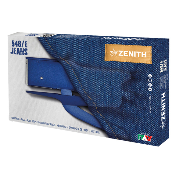 Realizzata interamente in metallo verniciato con finiture nichelate. Verniciatura con smalti senza piombo ad alte caratteristiche di resistenza all'usura ed alla corrosione, con speciale modalita' di applicazione. Superfici del corpo e della maniglia presentano una leggera, piacevole rugosita', che ricorda quella del tessuto. G La cucitrice ZENITH 548/E JEANS puo' cucire anche con i punti ZENITH art.130/Z6 (lunghezza gambine 6 mm) fino ad uno spessore di 30 fogli.