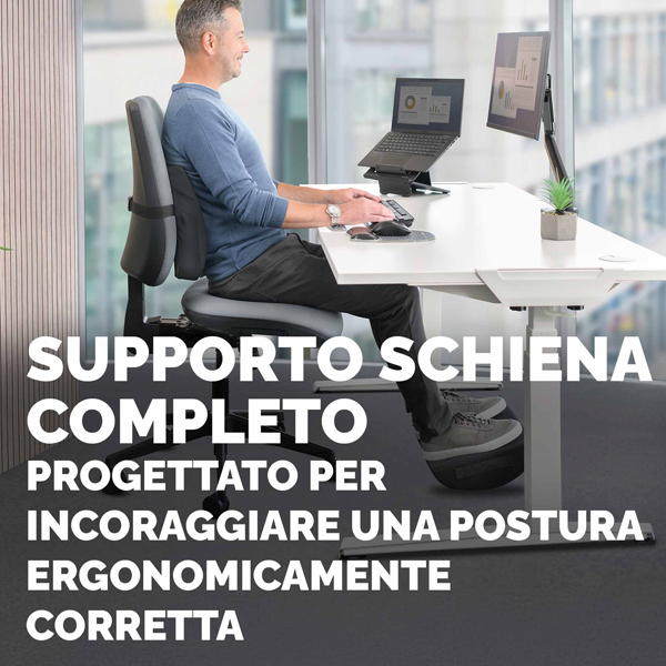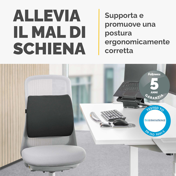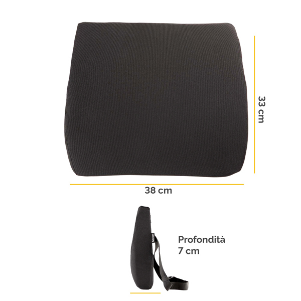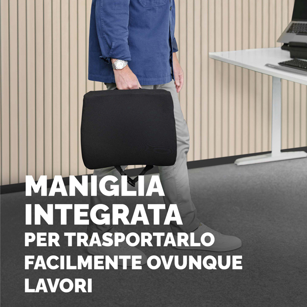 Progettato per aiutare a ridurre il disagio alla schiena fornendo supporto e incoraggiando una corretta postura ergonomica. La cinghia regolabile facile da usare mantiene il supporto saldamente in posizione. Maniglia di trasporto integrata per un facile trasporto ovunque tu lavori. La schiuma contiene contenuto riciclato post-consumo da m aterassi. Rivestimento in tessuto realizzato al 100% in poliestere riciclato post-consumo.rgonomicamente testato da FIRA International come adatto allo scopo. Dimensioni 33x 38 x 9 cm.