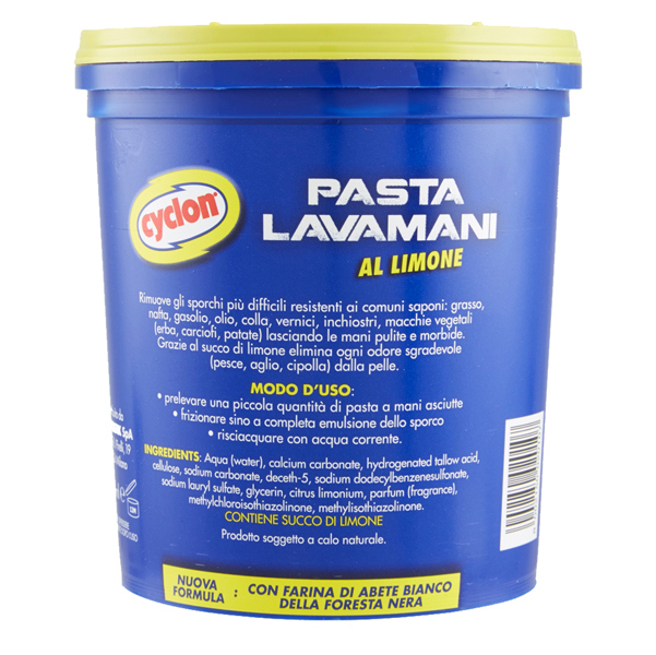 Cyclon pasta lavamani al limone per rimuovere energicamente dalle mani lo sporco piu' difficile e resistente (grasso di motori, olio, nafta, ecc).
