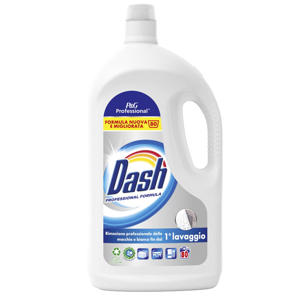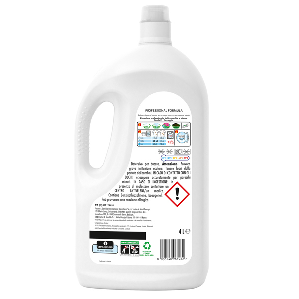 Detersivo liquido lavatrice per uso professionale 80 lavaggi (4 litri). Risultati professionali, bianchi brillanti gia' a 30 gradi C. Dona bianco impeccabile e pulizia profonda ai tessuti lasciandoli gradevolmente profumati. Formula nuova e migliorata. Bottiglia e tappo in plastica 100% riciclati.