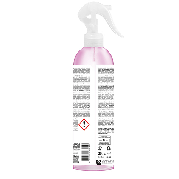 DEO SPRAY Emozioni Fiorite 300ml. Deodorante per ambienti e tessuti. La sua particolare formulazione neutralizza le molecole dei cattivi odori e garantisce una persistente profumazione negli ambienti trattati. - IMPIEGO: camere d'albergo, bagni, saloni, cucine, interni auto, scarpiere, ripostigli, cucce per animali, moquette e tessuti. - MODALITa' D'USO: Premere l'erogatore 2-3 volte dirigendo lo spruzzo verso l'alto o verso la specifica zona da deodorare. - pH 5,5.