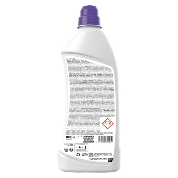 Detergente profumato con Sali d'ammonio quaternario per il lavaggio di superfici dure. Sgrassa a fondo lasciando l'ambiente gradevolmente profumato. Diluire il prodotto in acqua secondo le indicazioni, distribuirlo sulle superfici da trattare con panno, mop o lavasciuga. Non necessita di risciacquo. DOSAGGIO: 20-50 ml/L (2-5 tappi ogni 5 litri) in funzione al grado di sporco. Idoneo H.A.C.C.P.