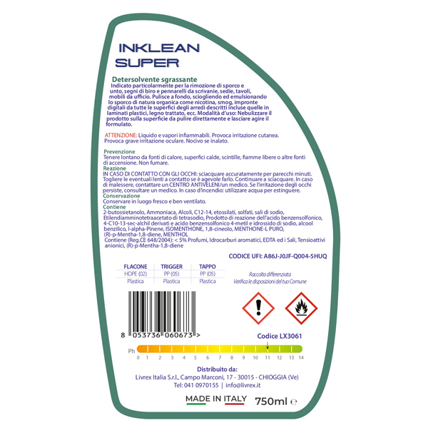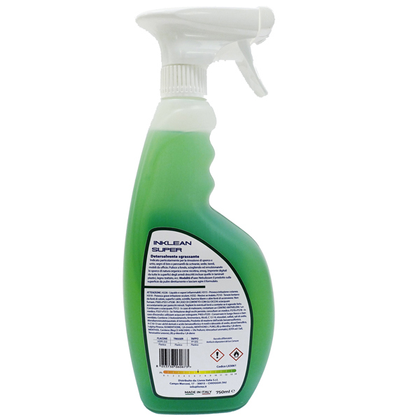 Sgrassante universale profumato pronto all'uso, ideale per la pulizia di tutte le superfici lavabili fortemente incrostate. La miscela dei suoi componenti garantisce un'istantanea pulizia anche su sporchi difficili (unto, grasso, inchiostro, pennarelli, ecc.), lasciando le superfici trattate lucide e prive di residui. Formulato per eliminare accumulo di grassi, olii, residui carboniosi, segni di pennarelli, inchiostro. Questo tipo di formulato e' adatto per le seguenti operazioni: -Rimozione di macchie da tavoli, scrivanie, moquettes sintetiche -Rimozione di residui carboniosi e di unto da forni, griglie, cappe, lavelli e piani in acciaio. -Pulizia di macchine nel settore meccanico -Pulizia di infissi -Pulizia di interni di automobili -Rimozione di residui di insetti dal parabrezza -Pulizia di cerchioni, fari, paraurti -Pulizia di computers -Rimozione di residui di gomma e segni di tacchi dai pavimenti -Deceratura a secco di pavimenti DOSAGGI e MODALITa' D'USO: per pulizie di fondo: Utilizzare INKLEAN SUPER puro oppure diluito 1:1. Spargere la soluzione sulla superficie da pulire con uno straccio, spugna o con un nebulizzatore per raggiungere gli angoli piu' difficili. per pulizie quotidiane diluire INKLEAN SUPER al 10% con acqua. CAMPO D'IMPIEGO: Rimozione di sporchi grassi e inorganici da tutte le superfici lavabili (ceramiche, banchi di lavoro, scrivanie, superfici in plastica etc.). per l'utilizzo su superfici di natura sintetica (vernice, PVC) e su gomma si raccomanda di verificare preventivamente il comportamento del prodotto su di una piccola porzione non visibile della stessa.
