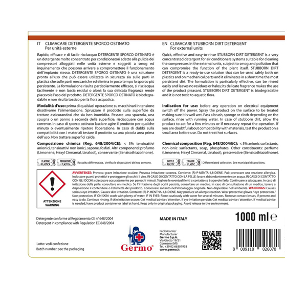 Detergente spray pronto all'uso molto concentrato che dissolve e disgrega ogni tipo di sporco. Rapido, efficace e di facile risciacquo e' adatto alla pulizia delle griglie, dei motori e dei condensatori d'aria; sporcizia, smog ed inquinamento, trattenuti dentro e fuori l'alloggiamento esterno che possono compromettere il funzionamento dell'impianto se non adeguatamente pulito e manutenuto; e' sicuro anche sulle parti in plastica. La formulazione super sgrassante, particolarmente efficace sullo sporco incrostato, si risciacqua facilmente e non lascia residui o aloni; la sua delicata fragranza rende particolarmente piacevole l'uso del prodotto. Il prodotto e' biodegradabile e non tossico per la flora acquatica. Flacone da 1000 ml con trigger.