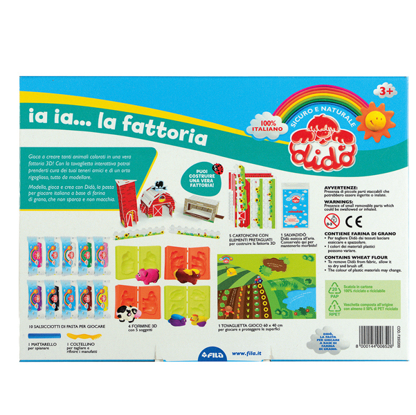Una fattoria in cartotecnica da montare sulla tovaglietta con le aree tematiche e animare con gli animali modellati con Dido'. La confezione contiene: 10 salsicciotti Dido', 4 formine 3D 5 soggetti, 1 tovaglietta gioco 60x40 cm, 5 cartoncini con elementi pre-tagliati per costruire la fattoria, 1 mattarello, 1 coltellino, 1 sacchettino salvadido', 1 leaflet Dido'.