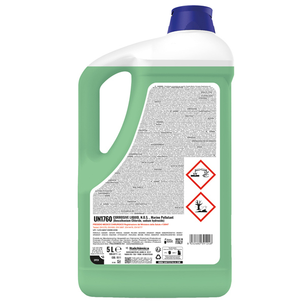 Disinfettante concentrato per uso ambientale PMC con azione fungicida e battericida, risultando attivo contro i batteri gram-positivi, gram-negativi, funghi e muffe, presenti negli ambienti domestici e professionali. Particolarmente adatto per disinfettare superfici e attrezzature del settore agro-alimentare, alberghiero e della ristorazione. Idoneo anche per l'uso in ambienti molto frequentati, quali bagni di locali pubblici, ambulatori e ambienti ospedalieri. Non profumato. Modalita' d'uso: diluire in acqua e nebulizzare o stendere con spugna o mop. Per piccoli utensili immergere il materiale da disinfettare. Risciacquare dopo l'uso. pH: 10,5. I tensioattivi contenuti sono biodegradabili secondo i criteri definiti dalla Direttiva Europea 648/2004/CE e successive modifiche. HACCP.