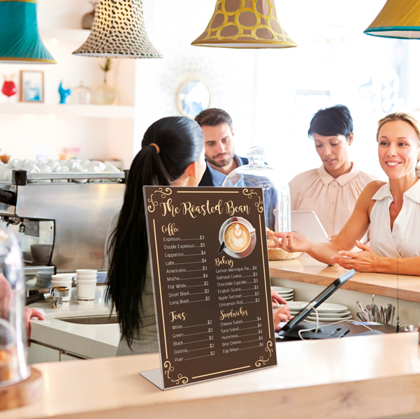Display in pet trasparente materiale riciclabile, idoneo al contatto con gli alimenti. Ottima resistenza agli urti e al fuoco. Ideale per ogni tipo di comunicazione e perfetto come porta menu' o porta listino. Portadepliant con base a l utilizzabile sia in verticale che orizzontale. Formato A5. Dimensioni 15x21cm, spessore 1,5mm.