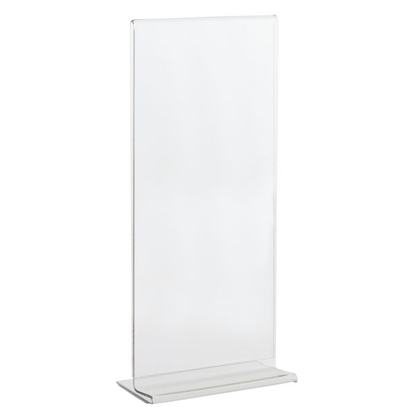 Display in pet trasparente materiale riciclabile, idoneo al contatto con gli alimenti. Ottima resistenza agli urti e al fuoco. Ideale per ogni tipo di comunicazione e perfetto come porta menu' o porta listino. Portadepliant con base a t formato 1/3 A4. Dimensioni 10x21cm, spessore 1,5mm.
