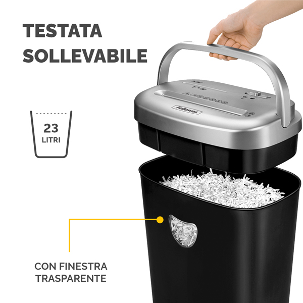Distruggidocumenti per uso personale occasionale. Taglio a frammento: 4x35mm. Imboccatura: 220mm. Capacita' di taglio 10 fogli da 70 gr / 9 fogli da 80 gr. Din: P-4. Cestino da 23 litri con testata facilmente sollevabile. Ciclo di lavoro: 3 on / 30 off. Livello rumorosita' 70 -75 dB. Distrugge graffette, punti metallici, carte di credito e CD. Dimensioni 40 x 33,8 x 19,6cm. Peso 6,8Kg.
