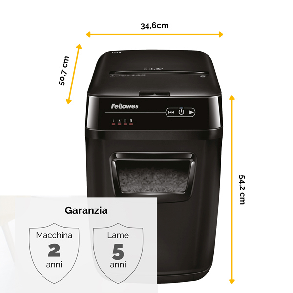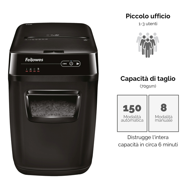 Distruggidocumenti a distruzione automatica per uso personale e piccoli uffici. La tecnologia Fellowes AccuFeed permette di distruggere fino a 130 fogli contemporaneamente con modalita' automatica, e fino a 8 fogli in modalita' manuale attraverso la fessura di inserimento apposita. Dotato di sistema di retromarcia automatico che previene gli inceppamenti e cestino estraibile da 32 litri, ha un ciclo di lavoro di 10 minuti. Distrugge anche carte di credito, posta indesiderata, carta spiegazzata o piegata, carta stampata a colori su entrambi i lati, documenti con graffette o punti metallici fino a 20 fogli.