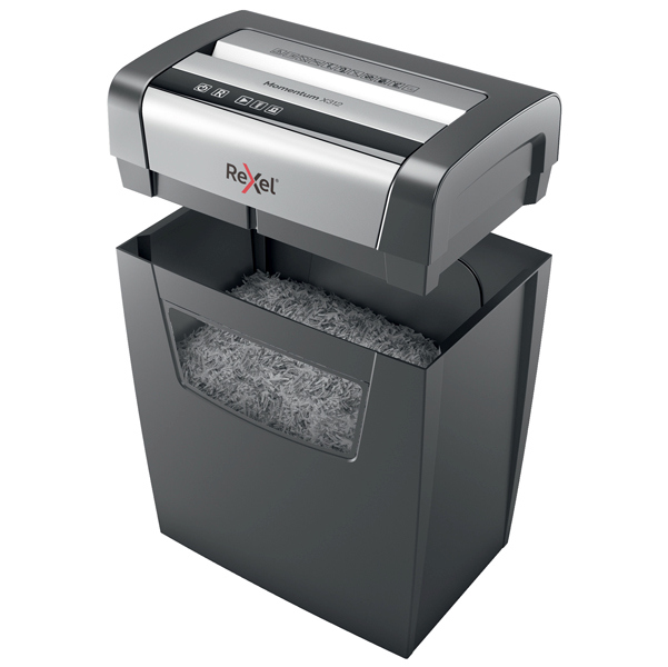 Il potere di distruggere di piu'! Rexel momentum X312 distrugge fino a 12 fogli per volta. Livello di sicurezza P3 con taglio a frammenti da 5x42 mm. Silenzioso, con pulsanti di controllo a sfioramento semplici e intuitivi per un facile utilizzo e una generosa capacita' del cestino da 23 litri. Tipo di taglio: frammento Dimensioni di frammento: 5x42mm Livello sicurezza: DIN P3 Imboccatura: 220mm Capacita' di taglio: 12 fogli Capacita' cestino: 23lt Ciclo di lavoro: 6min Ciclo di riposo: 60min Livello rumorosita': 62dB Funzione Jam Prevention: si Distruzione graffette e punti: si Distruzione Credit Cards/CD: no Pulizia automatica lame: no Autolubrificazione lame: no Voltage: 220v/240v 50hz/60hz Consumo energetico: 280 W Consumo energetico in modalita' Standby: 1.5w Power Cord / Plug: Fixed Garanzia: 2 anni Dimensioni: 380x420x275 mm Peso: 6,5Kg.