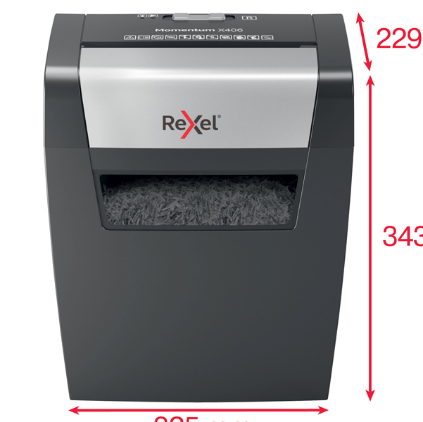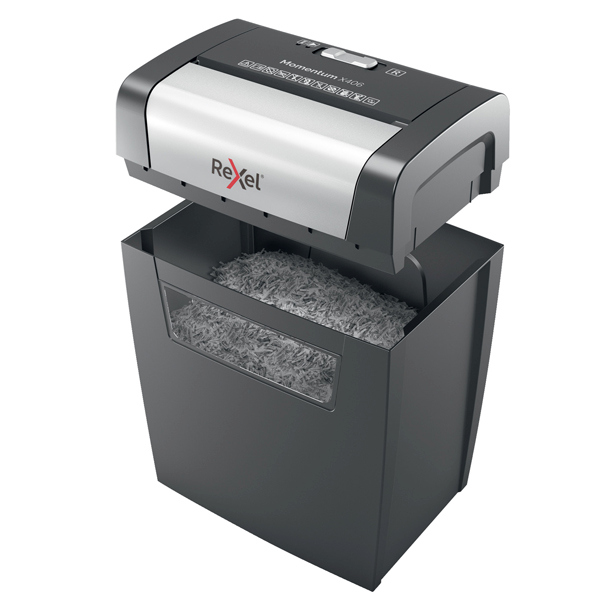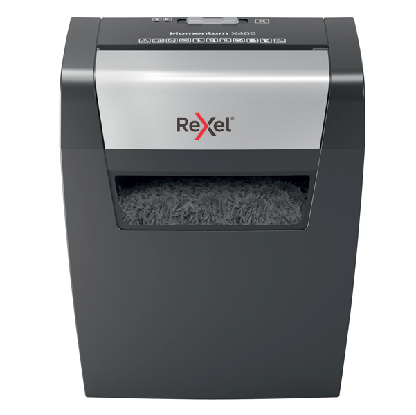 Il potere di distruggere di piu'. Rexel momentum X406 distrugge fino a 6 fogli per volta con un ciclo di lavoro continuo di 3 minuti che lo rende ideale per l'uso a casa. Livello di sicurezza P4 con taglio a frammenti da 4x30 mm. Capacita' del cestino da 15 litri (125 fogli A4) Distrugge fino a 6 fogli per volta Alto livello di sicurezza P4 con taglio a frammenti da 4x30 mm Distrugge piu' carta piu' a lungo con un ciclo di lavorazione continuo di 3 minuti Distrugge facilmente piu' documenti anche con punti e graffette agli angoli Un generoso cestino da 15L che contiene fino a 125 fogli A4 2 anni di garanzia.