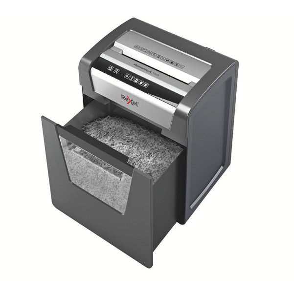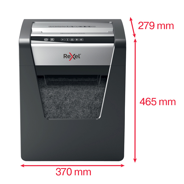 Il potere di distruggere di piu' rexel momentum x415 distrugge fino a 15 fogli per volta con un ciclo di lavoro continuo di 120 minuti. Livello di sicurezza p4 con taglio a frammenti da 4x40mm. Silenzioso, con pulsanti di controllo a sfioramento semplici e intuitivi per un facile utilizzo e una generosa capacita' del cestino da 23 litri. Tipo di taglio frammento di dimensioni 4x40mm, livello sicurezza di p4 imboccatura 223mm capacita' di taglio 15 fogli, con una rumorosita' di 62db. Ciclo di lavoro 120 minuti; ciclo di riposo 120/60 minuti funzione release. Tecnologia anti-inceppamento, il distruggi documenti si ferma e le lame si invertono automaticamente quando viene inserita troppa carta, distrugge facilmente anche documenti con graffette e punti. Credit cards/cd no pulizia automatica lame no autolubrificazione, lame no voltage 220v/240v 50hz/60hz consumo energetico 280w consumo energetico in modalita' standby 1,5w power cord/plug fixed. Garanzia 2 anni. Dimensioni 370x465x279mm. Peso 12,5kg.