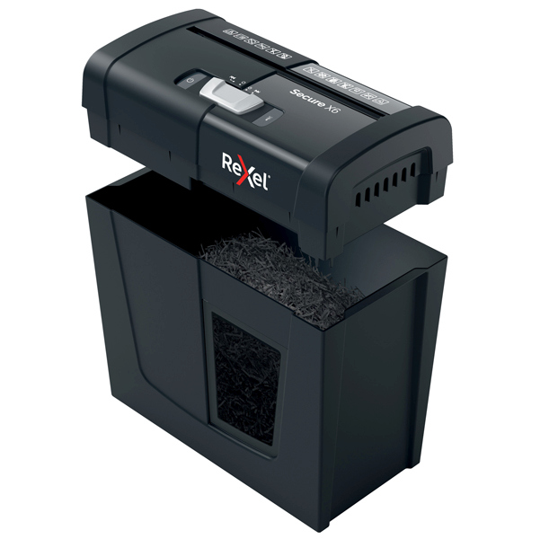 "Distrugge fino a 6 fogli A4 (80 g / mq) contemporaneamente Taglio a frammenti con livello di sicurezza P-4 DIN. Capacita' del cestino di 10 litri (100 fogli A4) con testata sollevabile. Cestino con finestra trasparente per vedere quando e' pieno. Funzionamento silenzioso min. 70 dBA Distrugge punti e graffette Ciclo continuo di 3 minuti Funzione manuale di marcia avanti / indietro 2 anni di garanzia, 2 anni di garanzia sulle lame" Dimensioni (LxHxP): 179x354x277mm Peso: 5,6Kg.