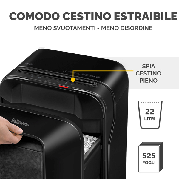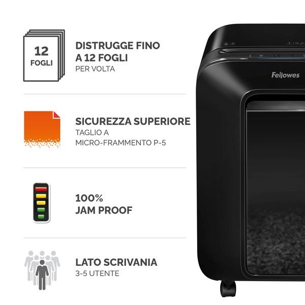 Distruggidocumenti dotato di IntelliBAR, la tecnologia reattiva di nuova generazione per un'esperienza di distruzione dei documenti piu' efficiente e in grado di garantire la massima produttivita'; Risponde a 5 esigenze: rileva e risolve automaticamnete gli inceppamenti; dotato di tecnologia SafeSense, la tecnologia protettiva che rileva automaticamnete se le mani o gli animali domestici sono troppo vicini e interrompe immediatamente la distruzione; feedback continuo sulla possibilita' di inserire piu' fogli per volta per massimizzare l'efficienza; indicatore cestino pieno; indicatore ciclo di lavoro, ti avverte quando il distruggidocumenti sta terminando il suo ciclo di lavoro e necessita di un periodo di pausa. Funzionamento silenzioso (65/70 dB). Imboccatura: 230mm. Riduce in microframmenti (2x12mm) fino a 12 fogli da 70 gr per volta. Velocita' di taglio: 2 MPM. Livello sicurezza P5. Ciclo lavoro: 10min on / 15min off. Capacita' cestino 22lt. Colore nero. Dimensioni: 527x356x254mm. Peso: 9kg.