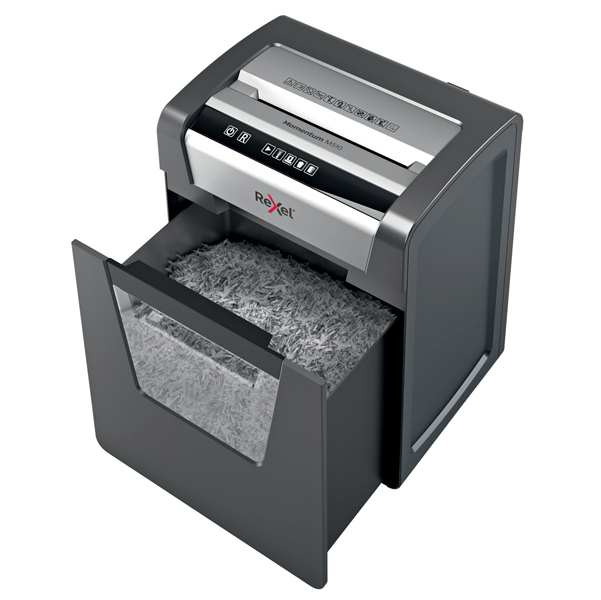 Il potere di distruggere di piu'! Rexel momentum M510 distrugge fino a 10 fogli per volta con un ciclo di lavoro continuo di 2 ore che lo rende ideale per il piccolo ufficio. Il distruggidocumenti M510 e' dotato di tecnologia anti-inceppamento che garantisce la distruzione ininterrotta. Livello di sicurezza P5 con taglio in micro frammenti da 2x15 mm per una maggiore sicurezza ed una minore frequenza di svuotamento del cestino. Silenzioso, con pulsanti di controllo a sfioramento semplici e intuitivi per un facile utilizzo e una generosa capacita' del cestino da 23 litri (250 fogli A4) Distrugge fino a 10 fogli per volta Elevato livello di sicurezza P5 con taglio micro in frammenti da 2x15 mm Ciclo di lavorazione continuo di 2 ore Tecnologia anti-inceppamento, il distruggidocumenti si ferma e le lame si invertono automaticamente quando viene inserita troppa carta Distrugge facilmente piu' documenti anche con punti e graffette agli angoli Tasti di controllo a sfioramento semplici ed intuitivi per operazioni facili. Grande capacita' del cestino che contiene fino a 250 fogli A4 Funzionamento silenzioso, interruzioni minime a casa o in ufficio 2 anni di garanzia.