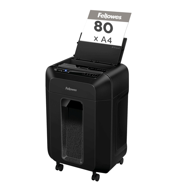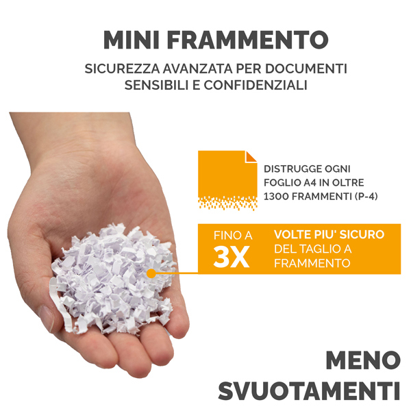 Distruggidocumenti ibrido automatico e manuale per uso personale. Distrugge 80 fogli in automatico e 8 fogli in manuale. Dimensione frammenti 4x12 mm, livello di sicurezza P4. Distrugge 100 fogli in 5 minuti. Ciclo continuo per 7 minuti. Spegnimento automatico dopo 2 minuti di inattivita'. Cestino da 17lt. Distrugge punti metallici, graffette e carte di credito.