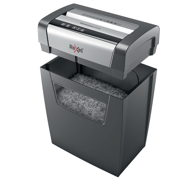 Il potere di distruggere di piu'. Rexel momentum X410 distrugge fino a 10 fogli per volta con un ciclo di lavoro continuo di 6 minuti ed un design sottile che lo rende ideale per l'uso a casa. Il distruggidocumenti X410 e' dotato di tecnologia anti-inceppamento che garantisce la distruzione ininterrotta. Livello di sicurezza P4 con taglio a frammenti da 4x28 mm. Silenzioso, con pulsanti di controllo a sfioramento semplici e intuitivi per un facile utilizzo e una generosa capacita' del cestino da 23 litri (225 fogli A4) Tipo di taglio: frammento Dimensioni di frammento: 4x28mm Livello sicurezza: DIN P4 Imboccatura: 220mm Capacita' di taglio: 10 fogli Velocita' di sistruzione: 1,8 m per min Capacita' cestino: 23lt Capacita' cestino (fogli): 225 Livello rumorosita': 62dB Ciclo di lavoro: 6min Ciclo di riposo: 60min Funzione Release: si Distruzione graffette e punti: si Distruzione Credit Cards/CD: no Pulizia automatica lame: no Autolubrificazione lame: no Voltage: 220v/240v 50hz/60hz Consumo energetico: 280 W Consumo energetico in modalita' Standby: 1.5w Power Cord / Plug: Fixed.