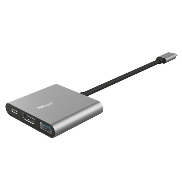 Con l'adattatore multiporta Trust Dalyx 3-in-1 USB-C, e' possibile ottenere il massimo dal laptop. E' possibile aumentare il numero di porte sul laptop e collegarsi a piu' dispositivi attraverso la porta HDMI, USB-A e USB-C per la ricarica. Versatile adattatore multiporta adatto per ogni laptop, MacBook e tablet dotato di porta USB-C. L'adattatore Dalyx consente di trasferire dati in modo estremamente rapido attraverso due porte USB-A alla velocita' massima di 5 Gbps tramite USB 3.2 Gen1. Non occorre installare alcun software aggiuntivo, basta inserire la spina e partire! Con un'unica porta USB-C sul dispositivo, Dalyx offre una connettivita' versatile. Collegando il tablet o il laptop a un monitor o alla TV tramite la porta HDMI, e' possibile vedere film e foto ad altissima risoluzione con colori nitidi grazie allo standard HDMI 1.4 (4k30Hz), ricaricare il laptop dalla porta USB-C con tecnologia PD (Power Delivery) e aggiungere altri dispositivi come la tastiera o un drive esterno tramite la porta USB-A. L'adattatore si presenta in una resistente struttura in lega di alluminio pressofuso, che rappresenta un complemento raffinato per arredare la scrivania e il kit di lavoro, ma e' anche perfetto per i viaggi grazie al formato compatto.