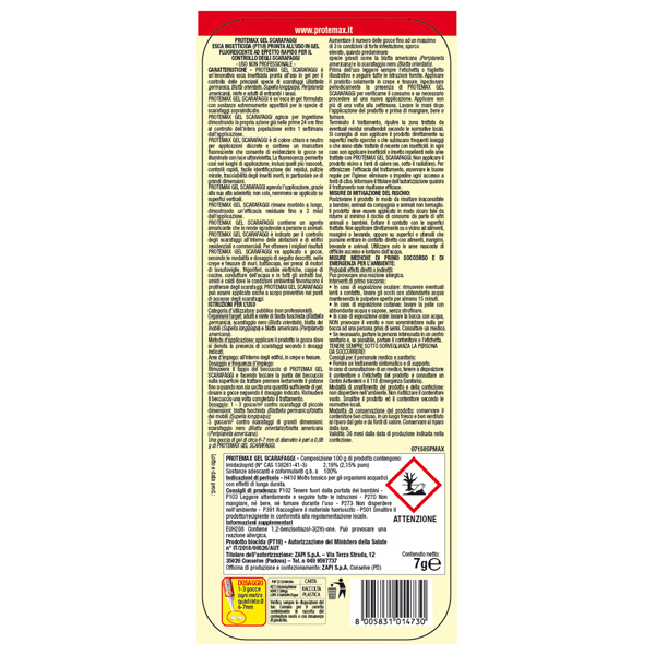Esca gel insetticida pronta all'uso per il controllo di scarafaggi con sostanze ad alta appetibilita'. Rimane morbido a lungo, garantendo la sua efficacia fino a 3 mesi dall'applicazione. Indicato per: il controllo degli scarafaggi all'interno di abitazioni e di edifici residenziali o commerciali. Agisce per ingestione dimostrando la propria azione gia' nelle prime 24 ore fino al controllo dell'intera popolazione entro 1 settimana dall'applicazione. Dose: applicare il prodotto in gocce dove si denota la presenza di scarafaggi secondo i dosaggi indicati.1-3 gocce ogni metro quadrato diametro 6-7mm. Aree d'impiego: all'interno degli edifici, in crepe e fessure. Composizione: imidacloprid 2,19% (2,15% puro) registrazione: autorizzazione del ministero della salute n gradi it/2018/00526/aut di libera vendita.
