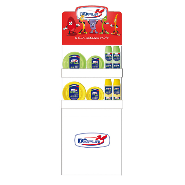 Espositore da terra 60cm x 40cm x H1,65mt (incluso crowner 37cm). Espositore con 2 vasche, realizzato in cartone, stabile e facile da montare. Istruzioni incluse. Contenuto piatti e bicchieri in Ps Reuse: 13 confezioni da 30 bicchieri 230ml colore giallo, 12 confezioni da 25 piatti piani diametro 22cm colore giallo, 7 confezioni da 25 piatti frutta diametro 17cm colore giallo, 13 confezioni da 30 bicchieri 230ml colore verde acido, 12 confezioni da 25 piatti piani diametro 22cm colore verde acido, 7 confezioni da 25 piatti frutta diametro 17cm colore verde acido.