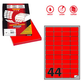 Scatola da 100fg da 21x29,7cm di etichette adesiva permanente rosso fluo. Etichette con angoli tondi. Adatte per stampanti inkjet, laser e copy. 44 etichette per foglio.
