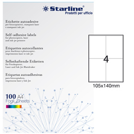 Etichette adesive bianche permanenti su foglio A4 STARLINE. Utilizzabili con stampanti laser, inkjet o fotocopiatori. Prive di margine di sicurezza lungo tutto il perimetro. In scatola da 100 fogli formato A4. Colore: bianco. Adesivo permanente. Angoli etichette: vivi a 90 gradi. Etichette Rettangolari. Materiale Carta. Formato A4 (21x29,7cm). Numero Etichette per foglio: 4. Dimensione etichetta: 105x140mm. Numero Etichette per scatola: 400 (4x100). Stampa laser, inkjet, copy. Spessore fogli: frontale 70gr piu' 52gr di supporto, per un totale di 122gr. Codice produttore: STL3036. Marca Starline.