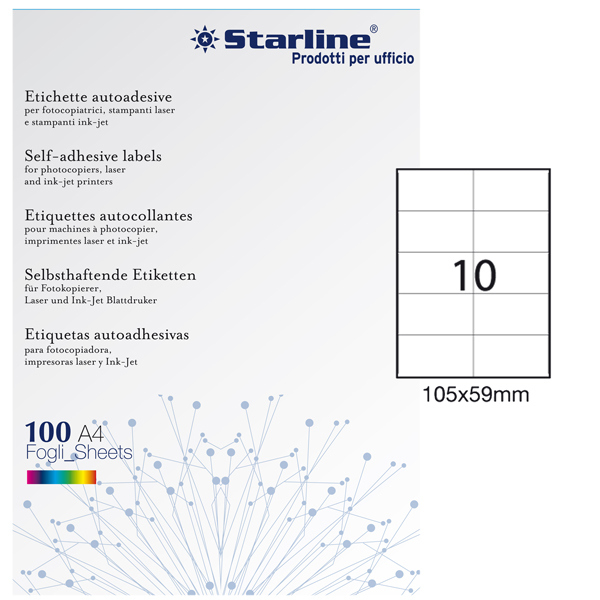 Etichette adesive bianche permanenti su foglio A4 STARLINE. Utilizzabili con stampanti laser, inkjet o fotocopiatori. Prive di margine di sicurezza lungo tutto il perimetro. In scatola da 100 fogli formato A4. Colore: bianco. Adesivo permanente. Angoli etichette: vivi a 90 gradi. Etichette Rettangolari. Materiale Carta. Formato A4 (21x29,7cm). Numero Etichette per foglio: 10. Dimensione etichetta: 105x59mm. Numero Etichette per scatola: 1000 (10x100). Stampa laser, inkjet, copy. Codice produttore: STL3031. Marca Starline.