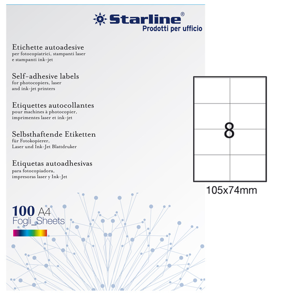 Etichette adesive bianche permanenti su foglio A4 STARLINE. Utilizzabili con stampanti laser, inkjet o fotocopiatori. Prive di margine di sicurezza lungo tutto il perimetro. In scatola da 100 fogli formato A4. Colore: bianco. Adesivo permanente. Angoli etichette: vivi a 90 gradi. Etichette Rettangolari. Materiale Carta. Formato A4 (21x29,7cm). Numero Etichette per foglio: 8. Dimensione etichetta: 105x74mm. Numero Etichette per scatola: 800 (8x100). Stampa laser, inkjet, copy. Spessore fogli: frontale 70gr piu' 52gr di supporto, per un totale di 122gr. Codice produttore: STL3034. Marca Starline.