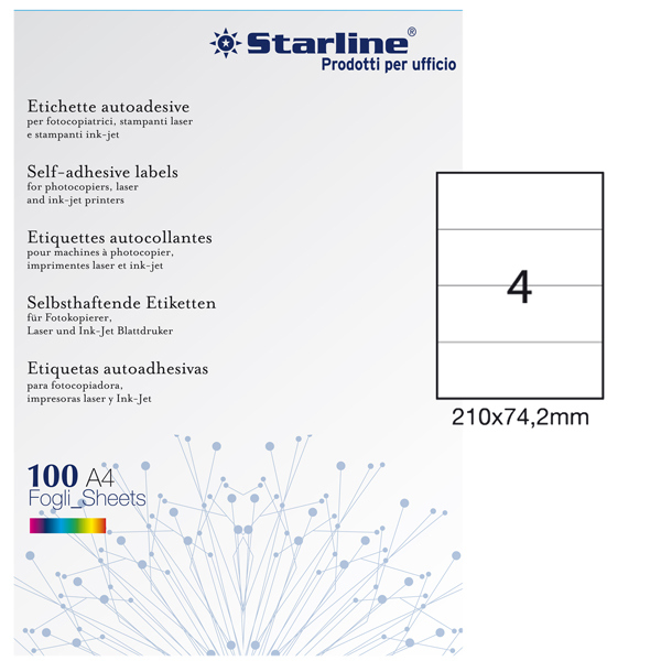Etichette adesive bianche permanenti su foglio A4 STARLINE. Utilizzabili con stampanti laser, inkjet o fotocopiatori. Prive di margine di sicurezza lungo tutto il perimetro. In scatola da 100 fogli formato A4. Colore: bianco. Adesivo permanente. Angoli etichette: vivi a 90 gradi. Etichette Rettangolari. Materiale Carta. Formato A4 (21x29,7cm). Numero Etichette per foglio: 4. Dimensione etichetta: 210x74,2mm. Numero Etichette per scatola: 400 (4x100). Stampa laser, inkjet, copy. Spessore fogli: frontale 70gr piu' 52gr di supporto, per un totale di 122gr. Codice produttore: STL3040. Marca Starline.