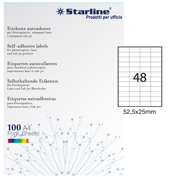 Etichette adesive bianche permanenti su foglio A4 STARLINE. Utilizzabili con stampanti laser, inkjet o fotocopiatori. Prive di margine di sicurezza lungo tutto il perimetro. In scatola da 100 fogli formato A4. Colore: bianco. Adesivo permanente. Angoli etichette: vivi a 90 gradi. Etichette Rettangolari. Materiale Carta. Formato A4 (21x29,7cm). Numero Etichette per foglio: 48. Dimensione etichetta: 52,5x25mm. Numero Etichette per scatola: 4800 (48x100). Stampa laser, inkjet, copy. Spessore fogli: frontale 70gr piu' 52gr di supporto, per un totale di 122gr. Codice produttore: STL3051. Marca Starline.