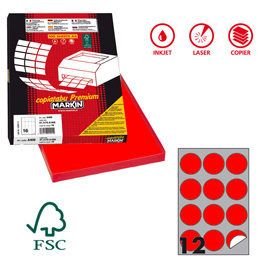 Scatola da 100fogli da 21x29,7cm (A4) di etichette in carta fluo rosso adesive permanenti nel formato. Stampabili con stampanti inkjet, laser e fotocopiatori. 12 etichette tonde per foglio. Produttore Markin.