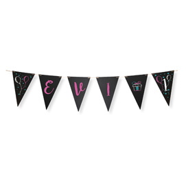 Festone formato da 14 bandierine lavagna (formato 22x15cm ciascuna), ideali per personalizzare la festa con messaggi sempre nuovi e divertenti. Fornito con pennarello a gesso liquido e filo da 4 metri.