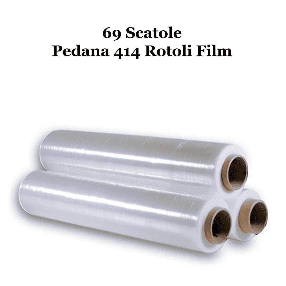 FILM ESTENSIBILE MANUALEFilm estensibile trasparente di polietilene(PE) ad elevata stirabilità per fasciatura pallets ed imballi in genere. Altezza rotolo 50cm, peso 2,4kg, spessore 23my. Contributo CONAI compreso nel prezzo. Cartone da 6 pezzi. Bancale da 69 scatole (6 pezzi x 69 scatole = 414 pezzi).