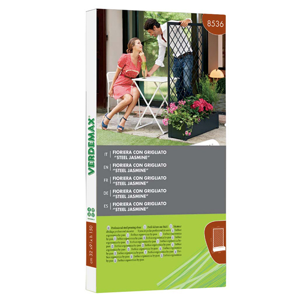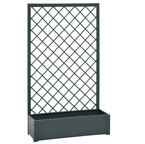 Fioriera in metallo con traliccio - Creata per dare prestigio a suggestivi angoli in giardino o dove necessita una divisoria robusta come creare dehors in pubblici esercizi (bar, ristoranti, agriturismi) ecc. Di colore antracite verniciate a polveri epossidiche. Dimensioni totali: L90 x P32 x H150cm - peso 11,6kg. Dimensioni interne della fioriera: L86 x P26 x H 27cm. La fioriera e' spedita smontata in scatola da 92x155x5 cm e pesa circa 12 Kg.